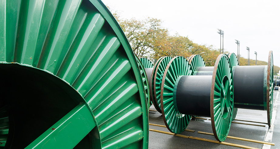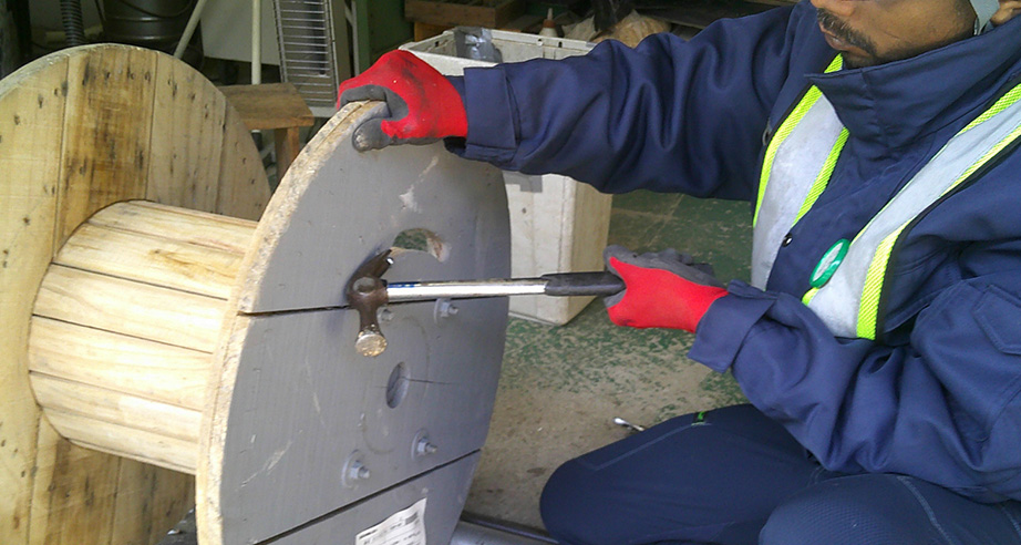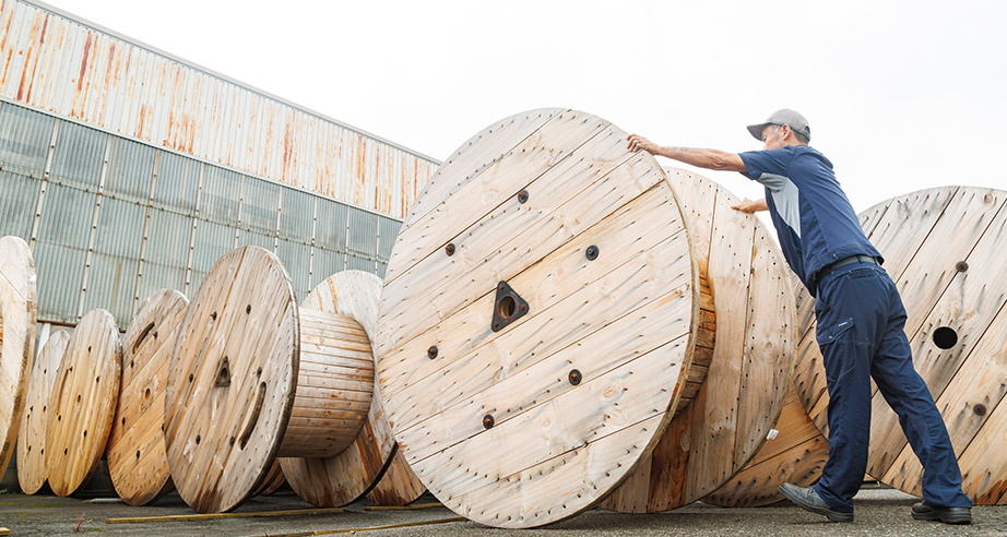電線のカット加工だけではありません。輸出向けの梱包業務にも対応しています。カットした電線は、長さや重量に応じて鉄製・木製・プラスチック製の各種ドラムに巻き付けることで輸送や保管時の取り扱いが容易になりますが、輸出梱包では、これをさらに強度の高い木枠や合板で外装し、湿気・塩害・振動・衝撃から保護します。外装にはバンドやボルトで固定。国際基準に適合した仕様にすることで、輸送中の破損・汚損・虫害を防ぎ、安全に海外まで届けることができるようになります。